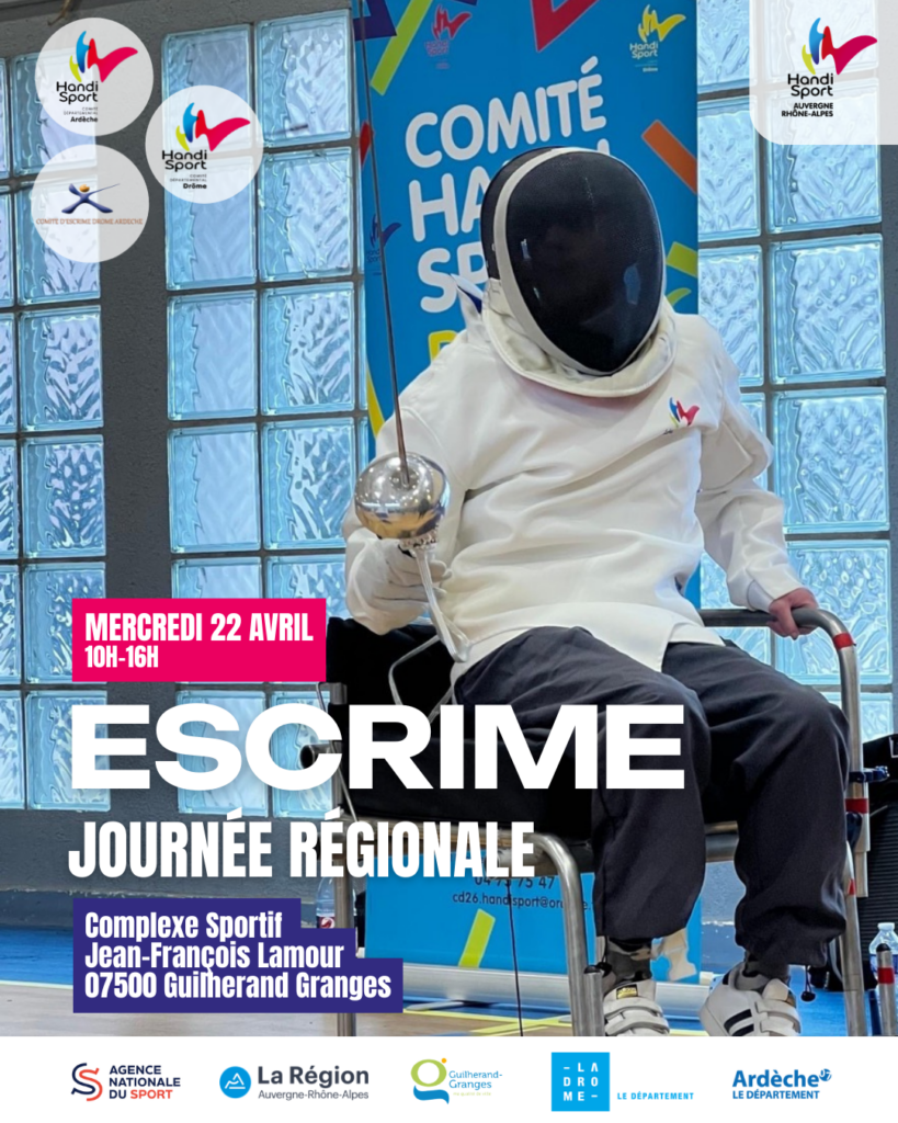 La Ligue, les Comités Handisport de l’Ardèche et de la Drôme et le Comité Drôme-Ardèche d’Escrime s’associent pour proposer une journée initiation escrime Handisport. La journée se déroulera le mercredi 22 avril de 10h à 16h à l’Espace sportif Jean-François Lamour Rue Pierre de Coubertin , 07500 Guilherand-Granges.